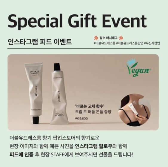 팝업스토어에서는 온라인 구매 인증고객에게는 립 모이스처라이저 10ml 증정, 현장 구매고객은 고벨류 GWP증정(3종파우치-5만 원 이상 구매 시, 토트백, 풍선), 러키드로우, 향기 MBTI, 포토부스 운영 등의 이벤트를 진행한다.