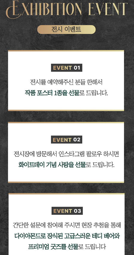 전시행사로는 현장에서 아트버디 더 럭셔리 SNS를 팔로우하시면 달콤한 사탕을 증정, 간단한 설문에 참여하면 현장 추첨을 통해 다이아몬드로 장식된 고급스러운 테디베어 키링과 프리미엄 굿즈를 증정한다.
