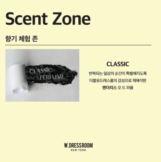 더블유드레스룸의 시그니처 향기 라인인 드레스퍼퓸, 핸드크림, 바디케어 라인은 물론! 무신사 단독으로 선 론칭되는 ‘젠더리스 오 드 퍼퓸, 클래식 퍼퓸 50ml’도 향기 체험존을 통해 더블유드레스룸 팝업스토어에서 가장 먼저 공개한다.