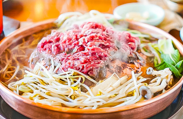 넉넉한 육수에 넉넉한 채소에 불고기를 얹어서 보글보글 끓이는 불고기 전골.