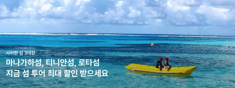 인기 많은 마나가하섬, 티니안섬, 로타섬 투어를 최저가 + 추가 2% 할인쿠폰까지 사용해서 사이판을 꼼꼼이 여행할 수 있다. 특히 한국인 가이드 투어를 통해서 언어 불편함 없이 아름다운 사이판 여행이 가능하니 참고하자.