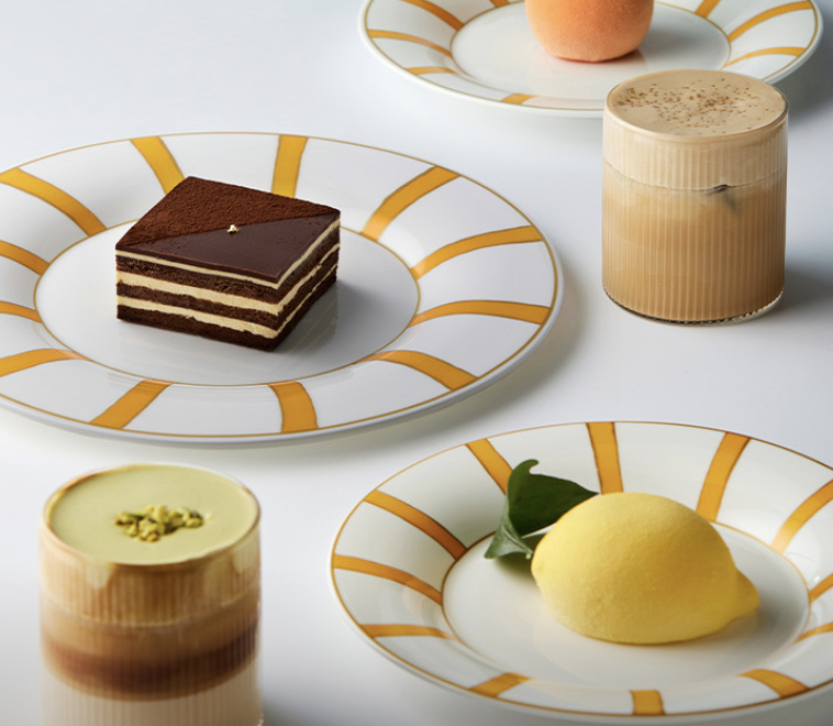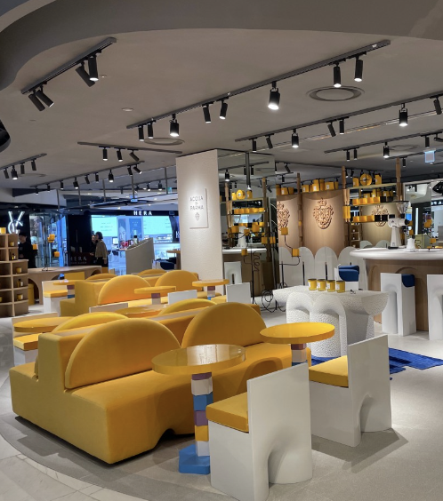 인테리어 건축가 도로테 메일리슈종이 디자인한 공간으로 멤피스 무브먼트의 강렬한 색채와 거대한 토템에서 영감을 받아 재해석한 아쿠아 디 파르마 옐로우 카페이다.