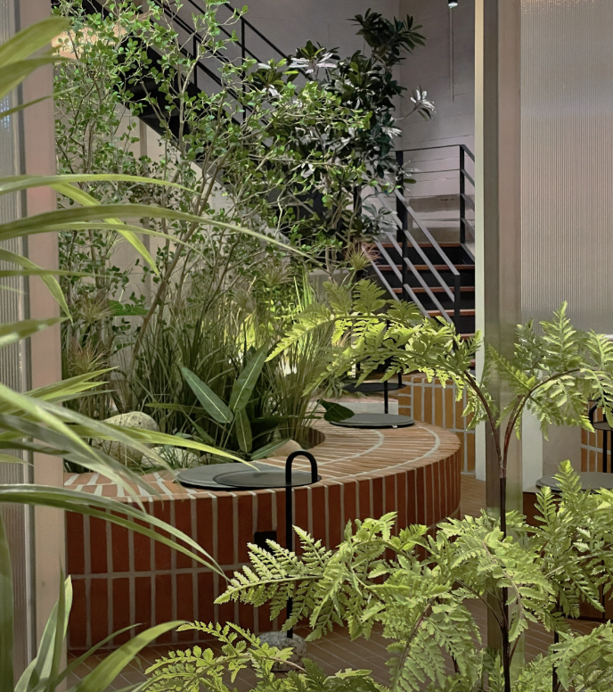 지하에 위치해있지만 답답하지않게 높은 층고의 매력과 자연을 바탕으로 공간을 채워 도심의 답답함에서 벗어날 수 있는 쉼터같은 곳이다.
