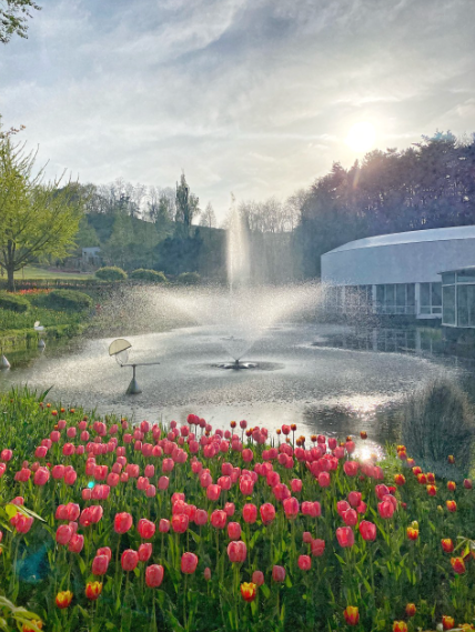 무엇보다 둥그스름한 저수지를 둘러싸고 브이(V) 자 형태와 물결 모양, 원형 모양으로 꾸며놓아 조형미가 돋보이며 오색튤립 꽃밭 산책로를 빙글빙글 돌아가며 걷는 맛이 있다.