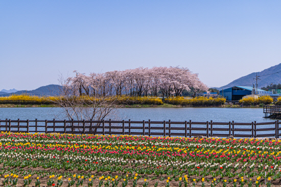 장평지의 또 다른 이름은 다초지로, 온갖 꽃과 풀이 한데 모여 피는 곳이란 뜻이다. 아담한 저수지 주변에 오밀조밀 피어난 튤립과 노란 유채까지 어우러진 풍경이 이색적이다.