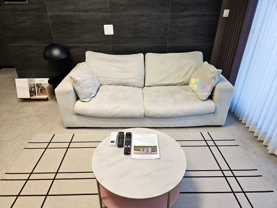 소파 바로 앞에 탁자는 컸기에 간단한 배달음식을 TV를 보면서 먹어도 좋고 술을 곁들여도 좋은 공간이었다. 일반 가정집과 다를 바 없는 구조와 분위기 덕분에 편하게 지낼 수 있고 낯설지 않다는 장점도 컸다.