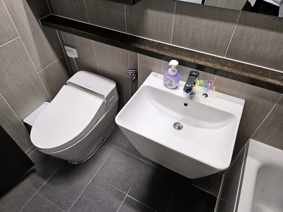 보조 침실 바로 옆, 그리고 입구에는 메인 화장실이 있다. 화장실, 세면대, 욕조가 준비되어있으니 아이가 있는 가정이라도 아이를 목욕시키는데 불편함이 없다. 이 곳 역시 여분의 화장실과 수건이 미리 준비되어있었다.