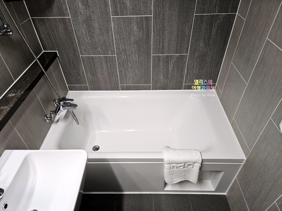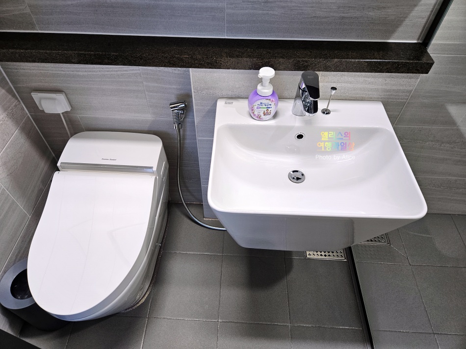 침실에 연결된 욕실은 화장실, 세면대, 샤워부스가 있다. 비록 비대면 체크인이지만 욕실에는 여분의 화장지와 수건이 갖춰져있기에 넉넉히 사용가능하고 추가 요청시 입구 비밀번호를 전송받은 번호로 문의하면 된다.