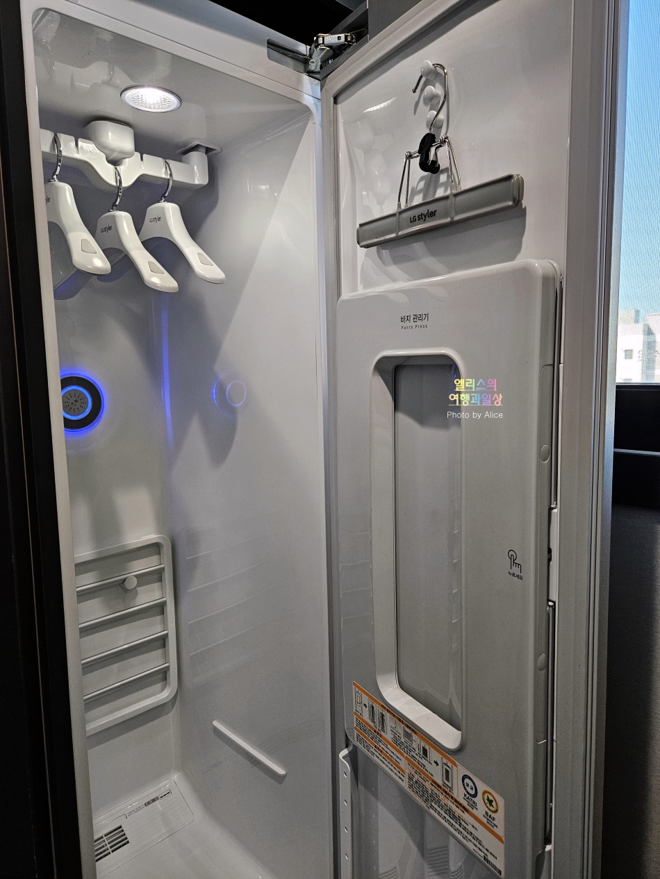 스타일러가 있으면 잠시 집을 떠나온 이에게 정말 편리한 기계다. 옷을 간편하게 관리할 수 있는데 마치 새옷같은 느낌을 줄 정도로 기능이 좋다. 보통 스타일러는 호텔에서 보기 어렵기 때문에 (럭셔리 호텔이라도 거의 없다.) 스타일러를 보니 무척 반가웠다. 이날 은근히 더워서 땀이 흘렀던 가벼운 겉옷을 스타일러에 넣고 뽀송하게 만들 수 있어서 무척 좋았다.