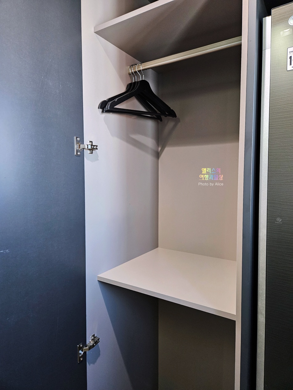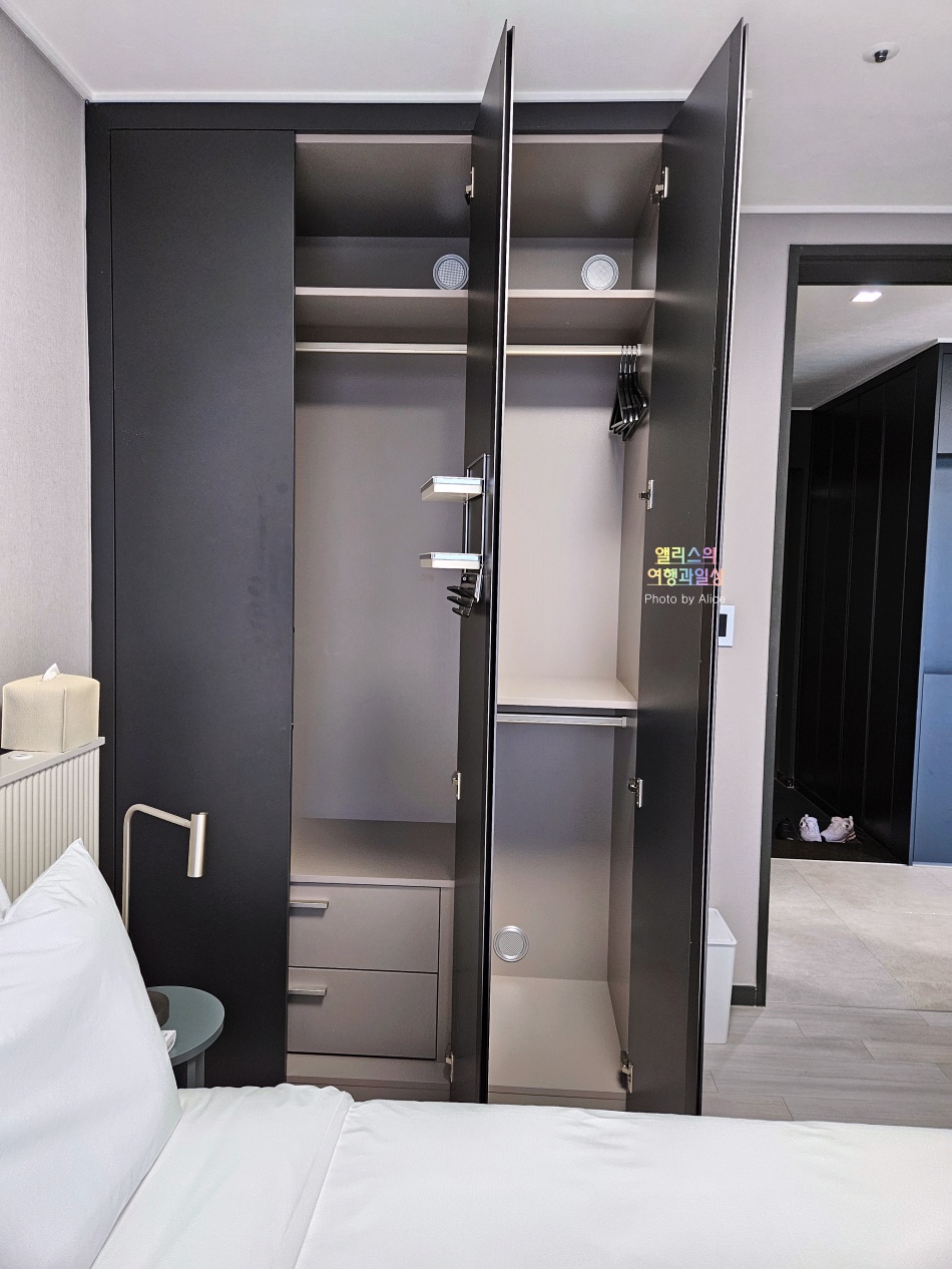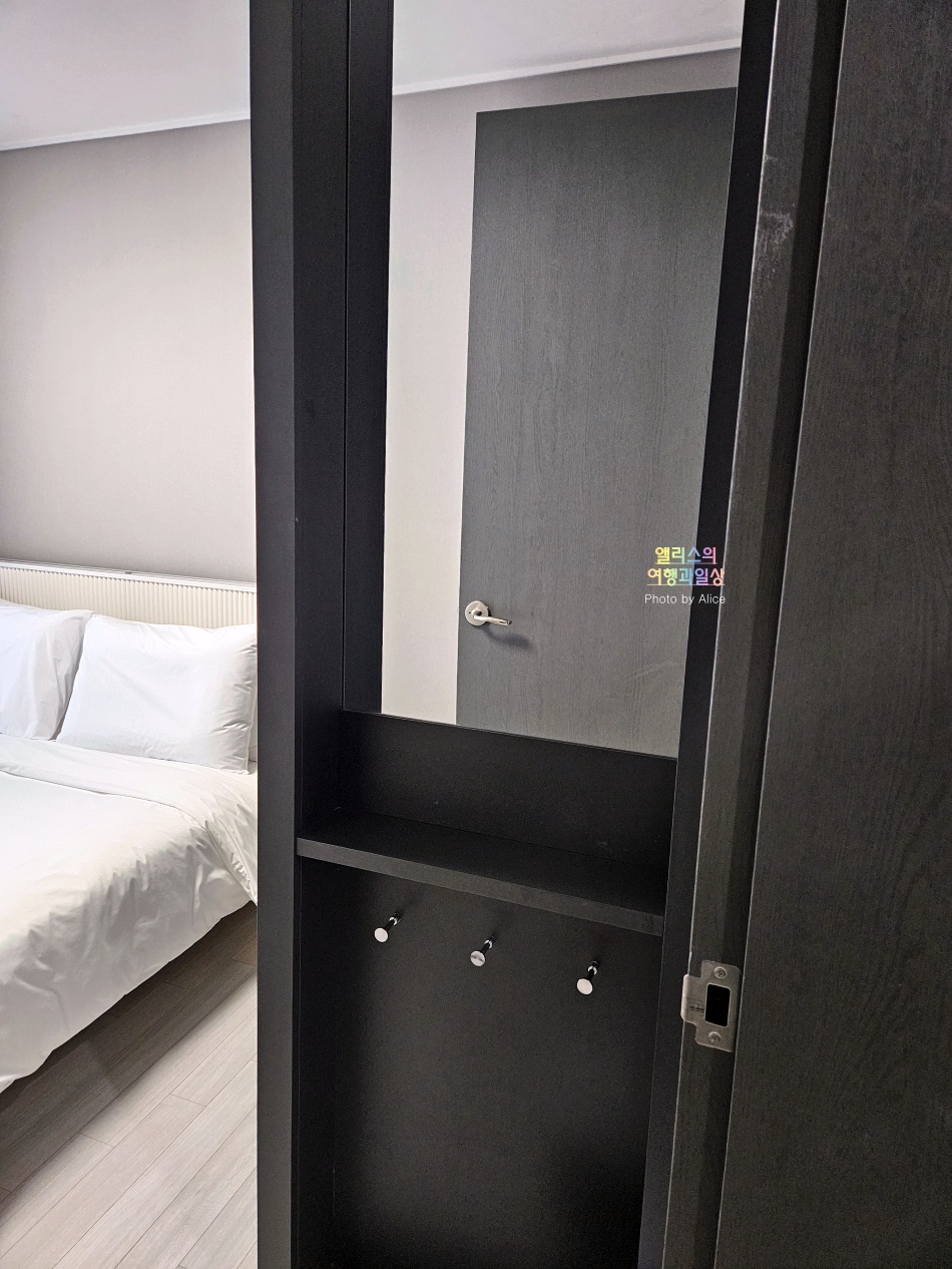 침대 바로 옆에 옷장이 크게 있어서 추가적인 옷을 수납할 수 있고 외출복이나 짐등을관리할 수 있다.