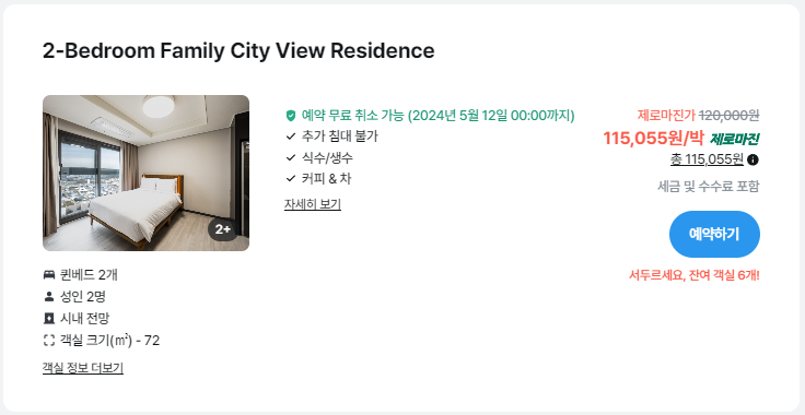 객실도 충분히 크고(72m²) 레지던스라서 충분히 거실, 침실, 부엌을 별도로 분리해서 이용할 수 있는데도 최저가 1박 기준 10~15만원대에 이용할 수 있어서 정말 가격이 착하다.