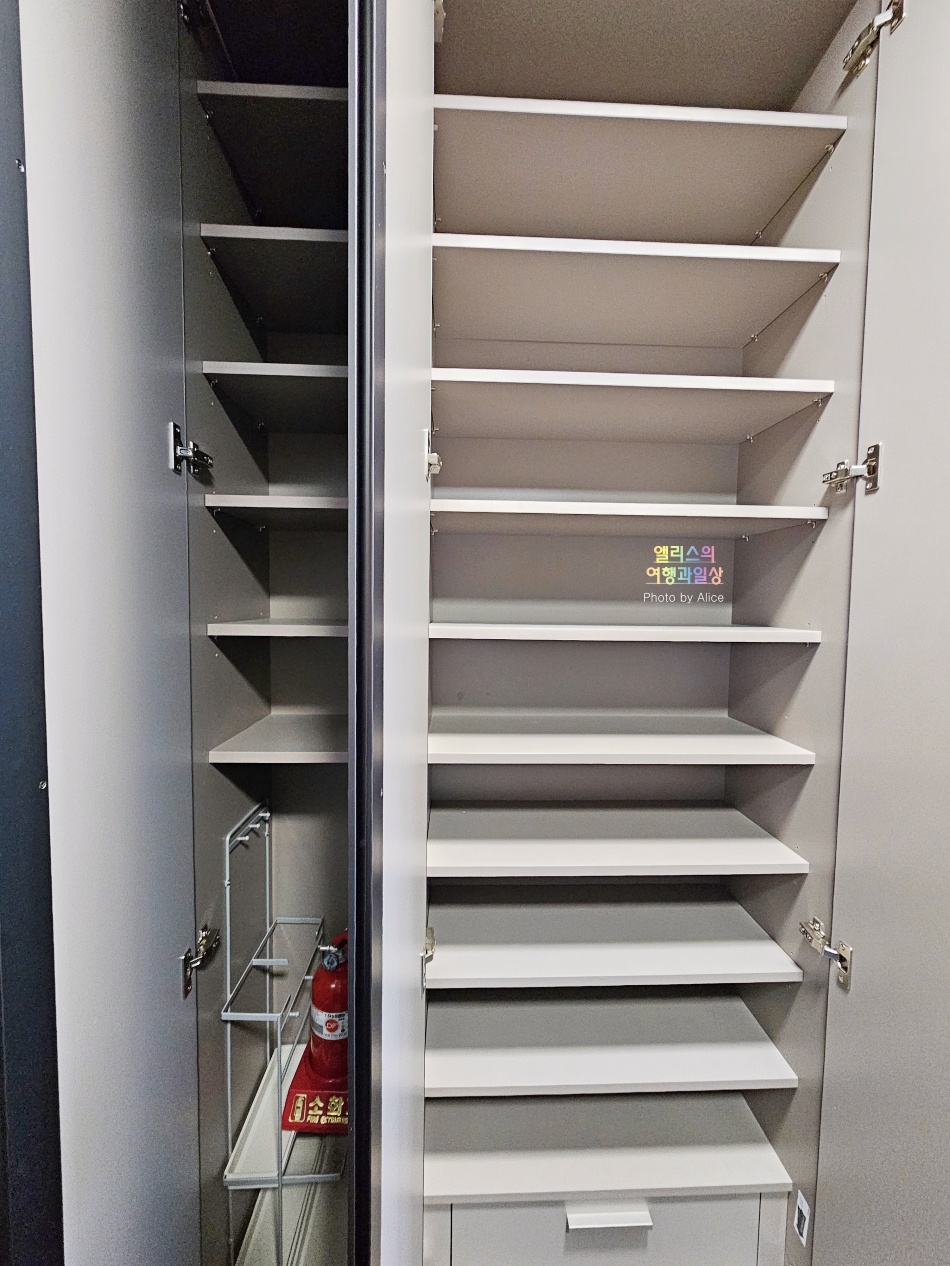 입구는 평범한 크기였지만 수납장은 절대 평범치 않았다. 많은 신발을 한 번에 수납할 수 있고 기타 등등의 짐등도 간편하게 수납할 수 있는 입구의 신발장&수납장은 여러명이 이 공간을 동시에 이용하더라도 수납이 편리할 수 있다는 장점이 컸다.