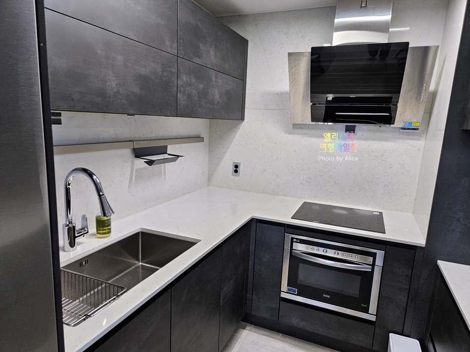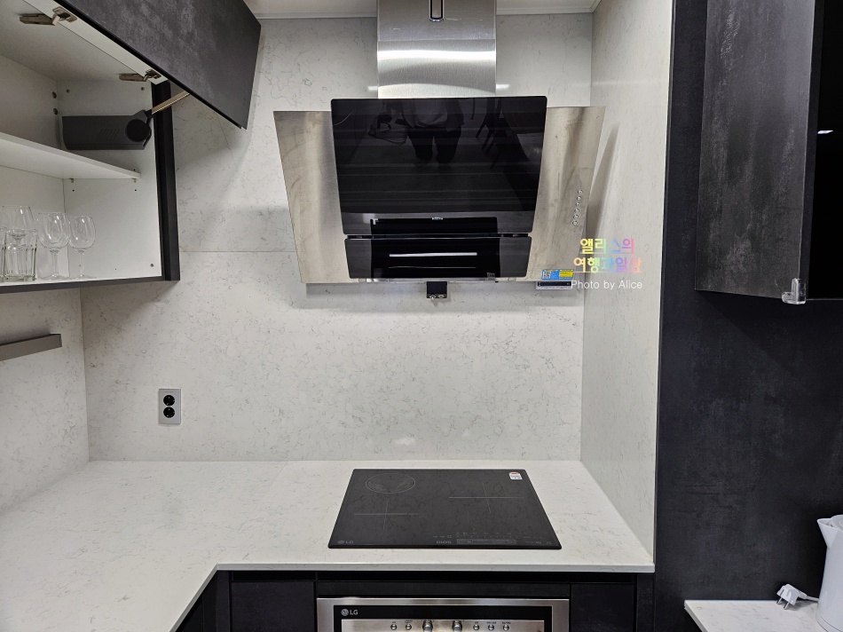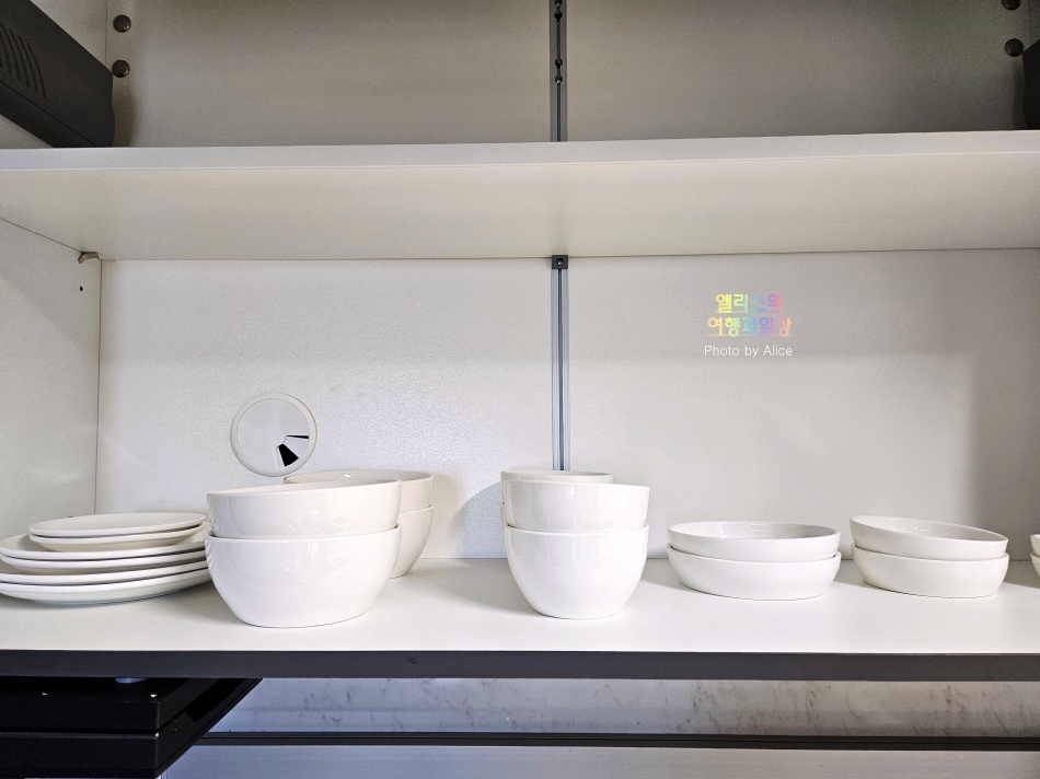 오븐겸 전자레인지, 인덕션등이 갖춰져있으니 간단한 음식을 해먹는 것은 어려운 일이 아니었고 식기와 도구도 갖춰져있으니 이것저것 챙기지 않아도 된다는 장점도 크다.