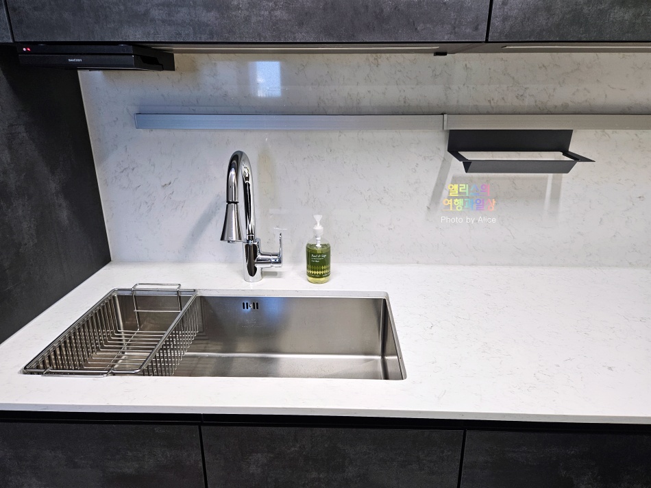 주방의 규모는 큰 편이었고 내 키보다 높은 수납장도 간편하게 한 번의 터치로 열수 있었다. 싱크대의 물을 틀 고 싶을 때는 발을 이용하면 틀수 있어서 양 손에 물을 묻힌 상태에서도 편하게 이용할 수 있었다.