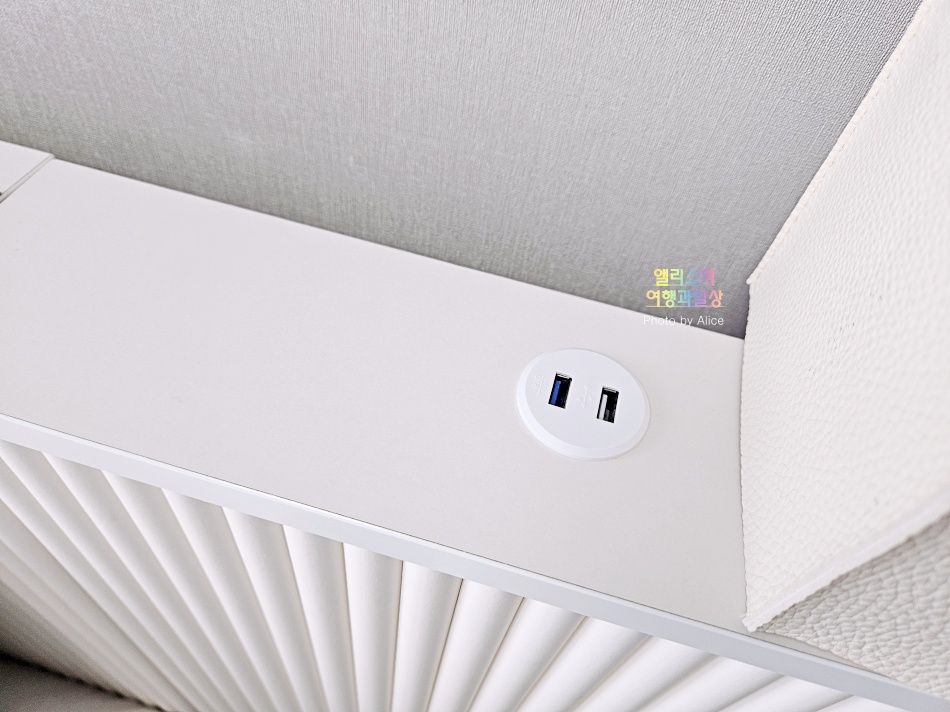 침대의 매트리스도 탄탄하고 이불도 포근해서 잠을 청하기 매우 좋았다. 그리고 침대 프레임은 USB 충전이 가능한 콘센트 단자가 있어서 머리 위에 핸드폰이나 기타 짐을 두고 충전할 수 있다.