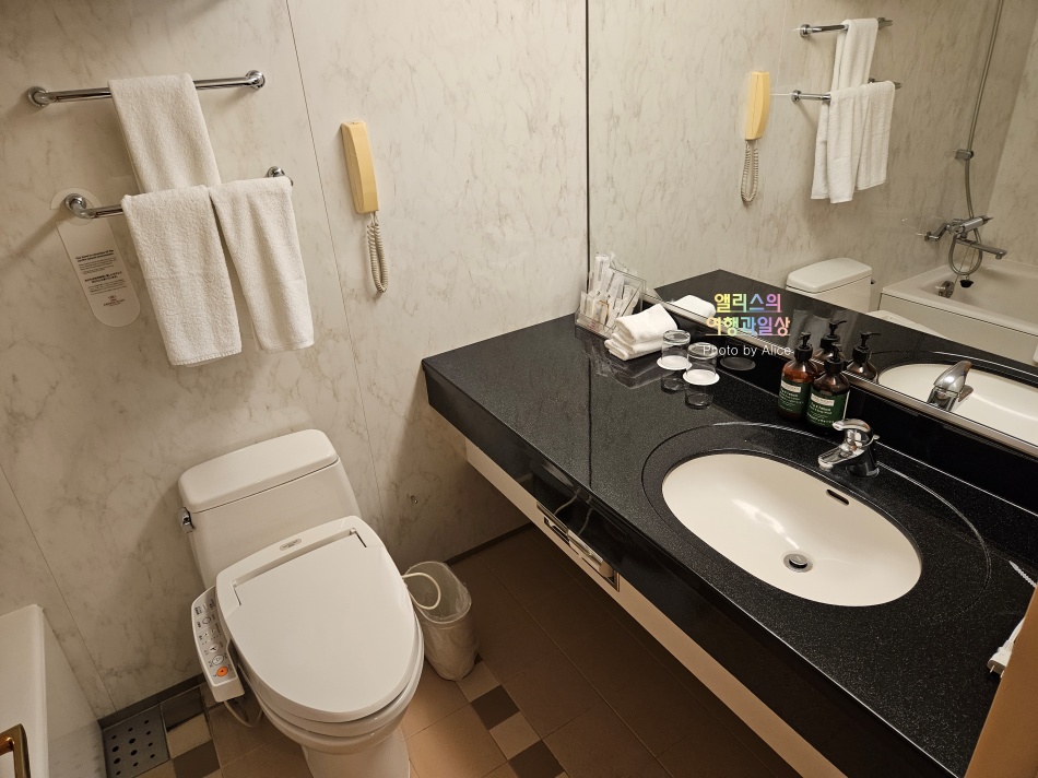조식은 종류가 많지는 않지만 맛있다. 욕실은 욕조와 샤워실, 화장실 분리되어 있다.
