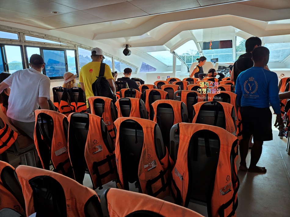 배가 크고 넓다는 점에서 좋았다. 그리고 무엇보다도 엔진 네개가 있는 덕분에 빠르게 이동가능한데 멀미가 걱정이라면 사실 어느 배를 타도 준비를 좀 해야하지 않을까 싶다. 나의 경우 평소에 멀미가 심하지 않은 편이어서 그런지 딱히 불편함없이 스피드 카타마란 배를 타고 섬 여러곳을 돌아볼 수 있었다.