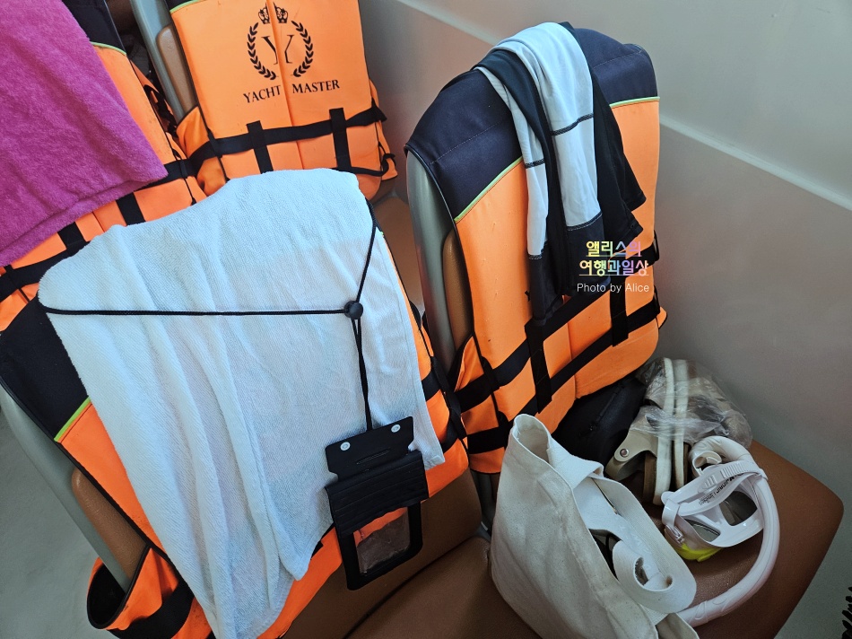 스노클링을 마치고 온 뒤 구명조끼는 대충 아무곳에 두어도 된다고 해서 그렇게 했는데 잠시 배에 내렸다가 다시 탑승하면 항상 깔끔하게 정리되어있었다. 수건도 대충 물기를 닦아내고 아무곳이나 놔두었는데도 예쁘게 정리되어 내 의자 위에 걸려있었다.