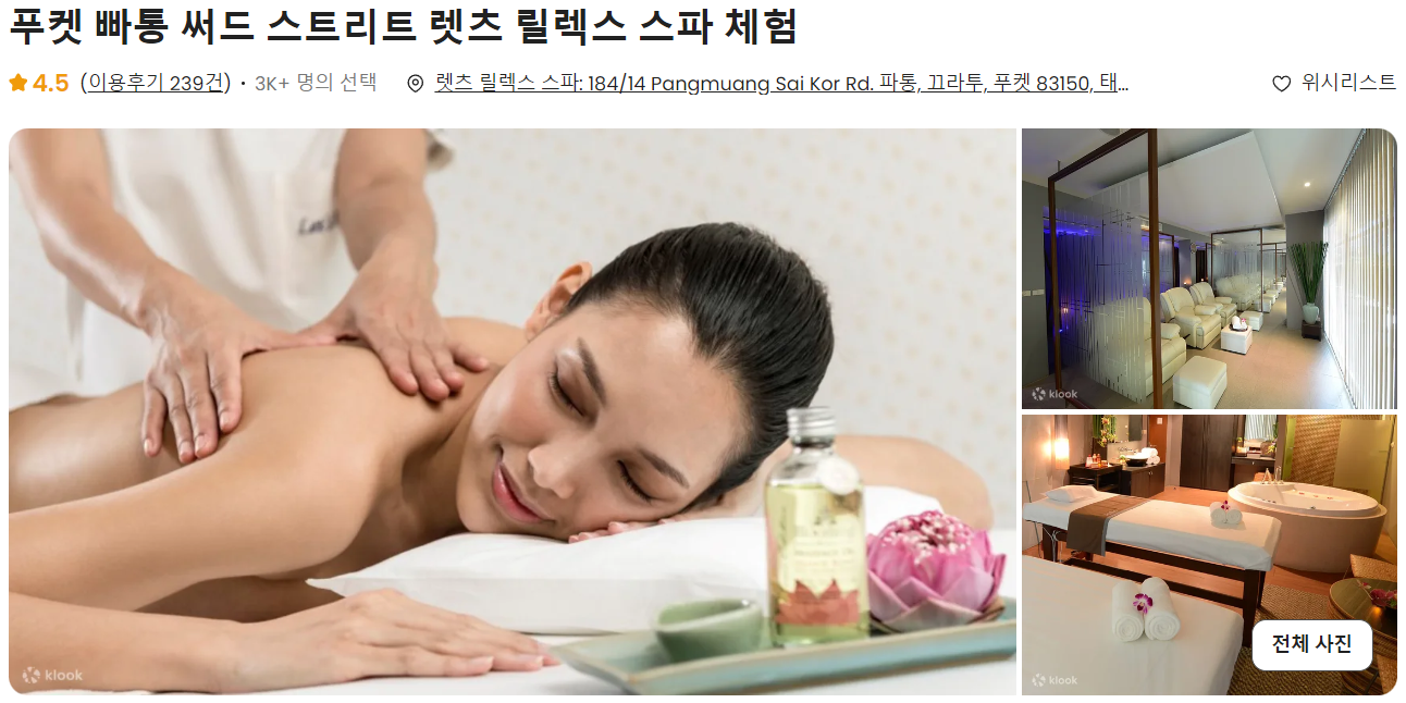 나는 클룩을 통해서 푸켓 마사지를 2회 예약했는데 그 중 하나가 렛츠 릴렉스 써드 스트리트 지점이다. 태국 마사지는 프로모션이 클룩에서는 자주 있으니 이를 활용하자.