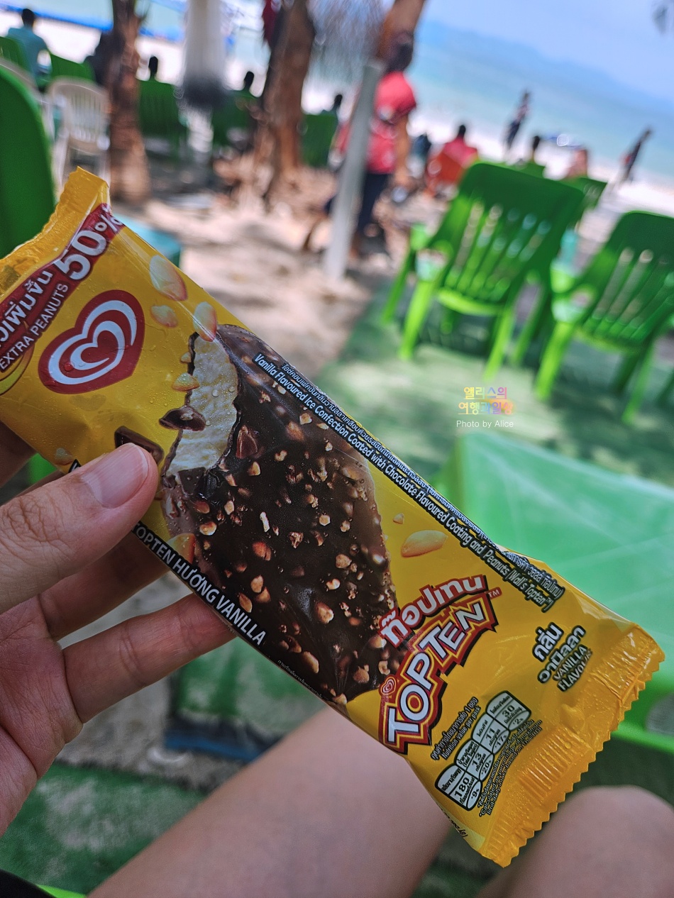 초코 아이스크림을 한 입 먹으며 시원한 그늘에서 바닷바람에 더위를 식히며 잠시 쉬는 시간을 가졌다.