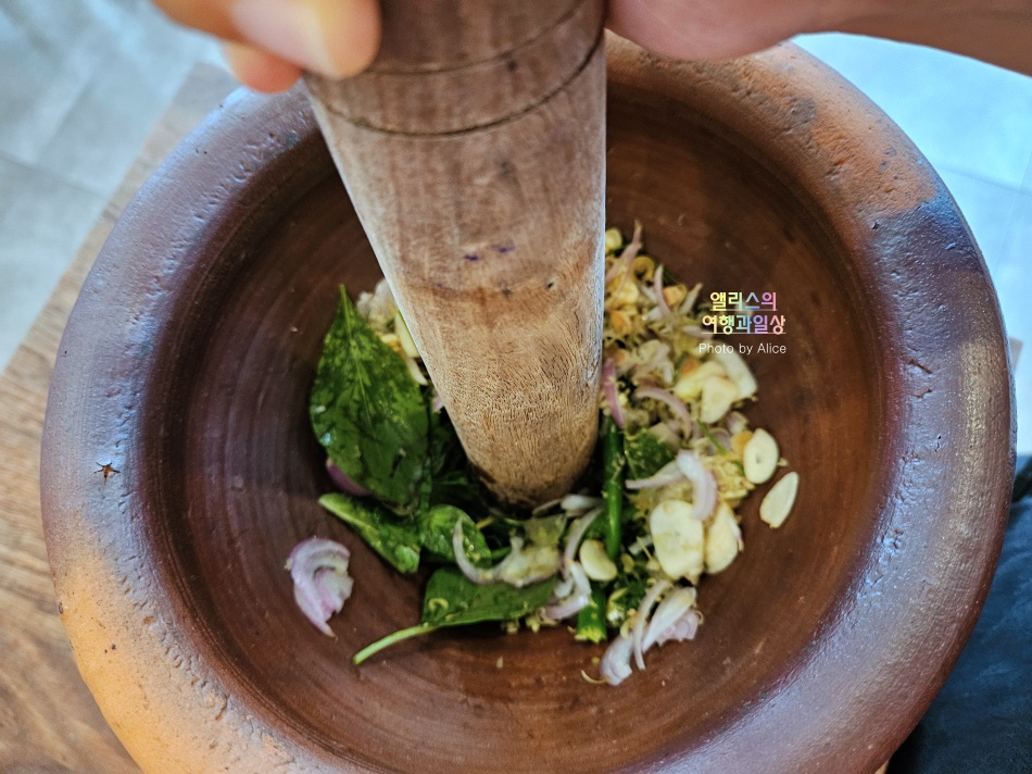 기본 식재료 설명을 듣고 향을 맡아보고 절구에 넣고 빻았다. 계속~~~ 빻으면 되는데 이게 좀 힘들어서 그렇지 생각보다 그린 커리 페이스트 만드는 방식이 복잡한 것은 아니었다. 오히려 저 식재료를 한국에서 구하는 것이 복잡할 수 있을 듯!