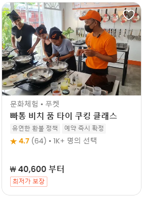 빠통 비치에서 진행되는 요리교실이다. 1인 신청부터 가능하고 4가지 워크샵 중 선택해서 태국 음식을 직접 만들어볼 수 있다.
