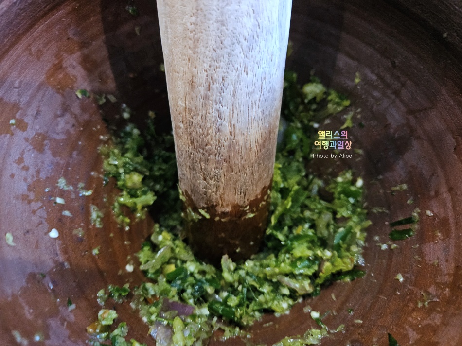 기본 식재료 설명을 듣고 향을 맡아보고 절구에 넣고 빻았다. 계속~~~ 빻으면 되는데 이게 좀 힘들어서 그렇지 생각보다 그린 커리 페이스트 만드는 방식이 복잡한 것은 아니었다. 오히려 저 식재료를 한국에서 구하는 것이 복잡할 수 있을 듯!