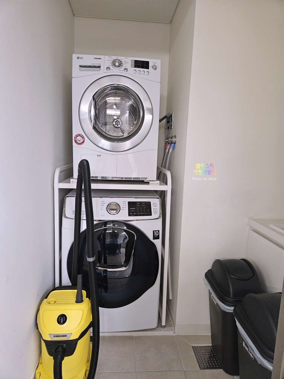 세탁기, 건조기외의 쓰레기를 간단하게 처리할 수 있는 다용도실도 별도로 있다. 이 덕분에 쓰레기 처리도 간편하고 깔끔하게 가능하고 해운대 바다에서 물놀이를 했다면 옷도 간편하게 빨래할 수 있는 구조라는 점도 마음에 든다.