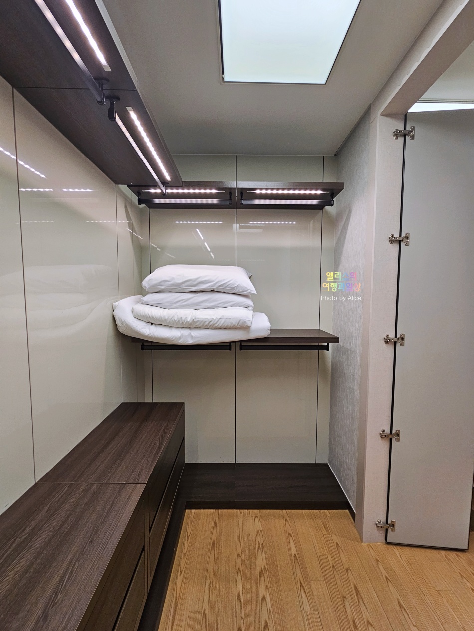 수납할 수 있는 옷도 정말 넉넉하게 수납가능하고 수납장도 넉넉하다. 여분의 이불도 있어서 인원이 증가해서 이불이 필요하면 그대로 사용 가능하다.