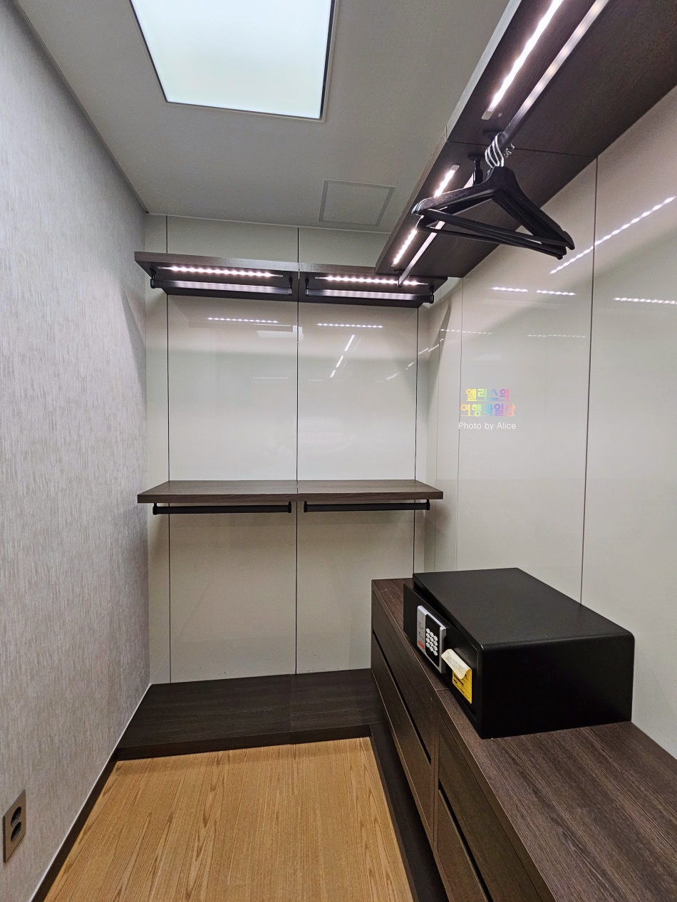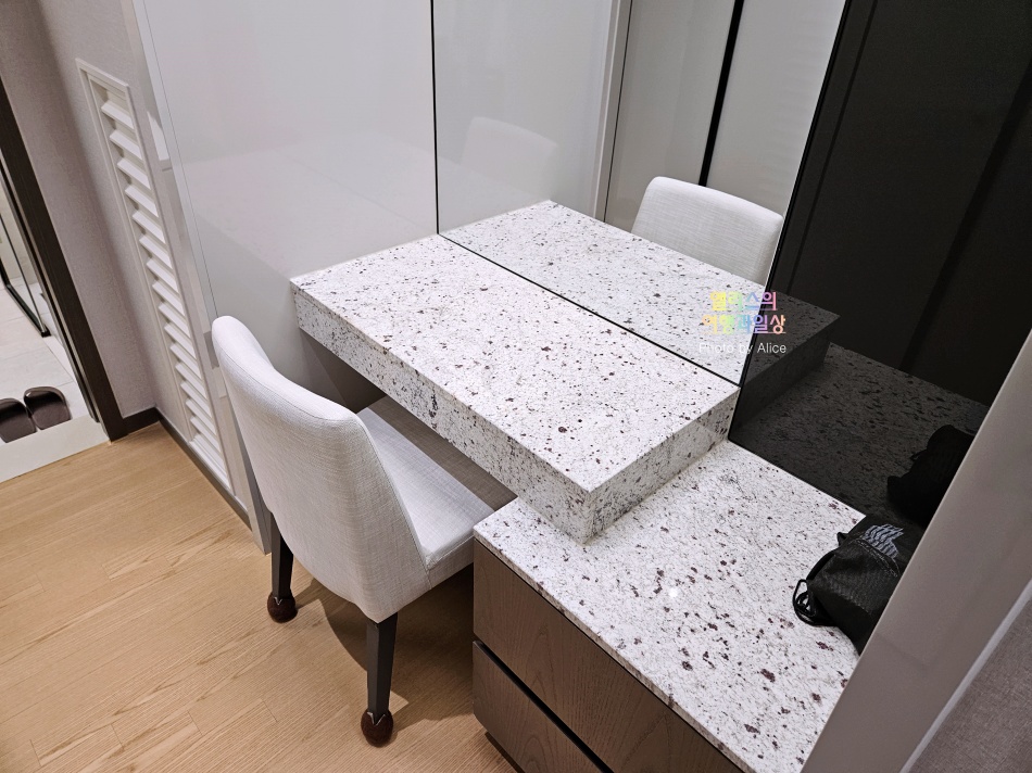 또 다른 침실 내에도 이렇게 화장대, 옷장 수납장, 욕실(샤워부스)가 별도로 있어서 사람이 여러면이 그랜드 엘시티 레지던스 오션 로얄 스위트에 머문다고 해도 욕실 사용의 불편함이 전혀 없을 것 같다.