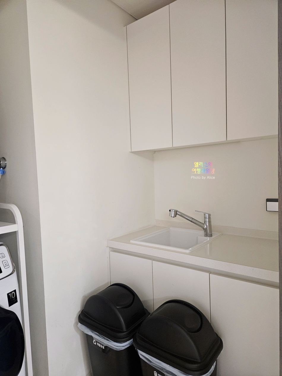 세탁기, 건조기외의 쓰레기를 간단하게 처리할 수 있는 다용도실도 별도로 있다. 이 덕분에 쓰레기 처리도 간편하고 깔끔하게 가능하고 해운대 바다에서 물놀이를 했다면 옷도 간편하게 빨래할 수 있는 구조라는 점도 마음에 든다.