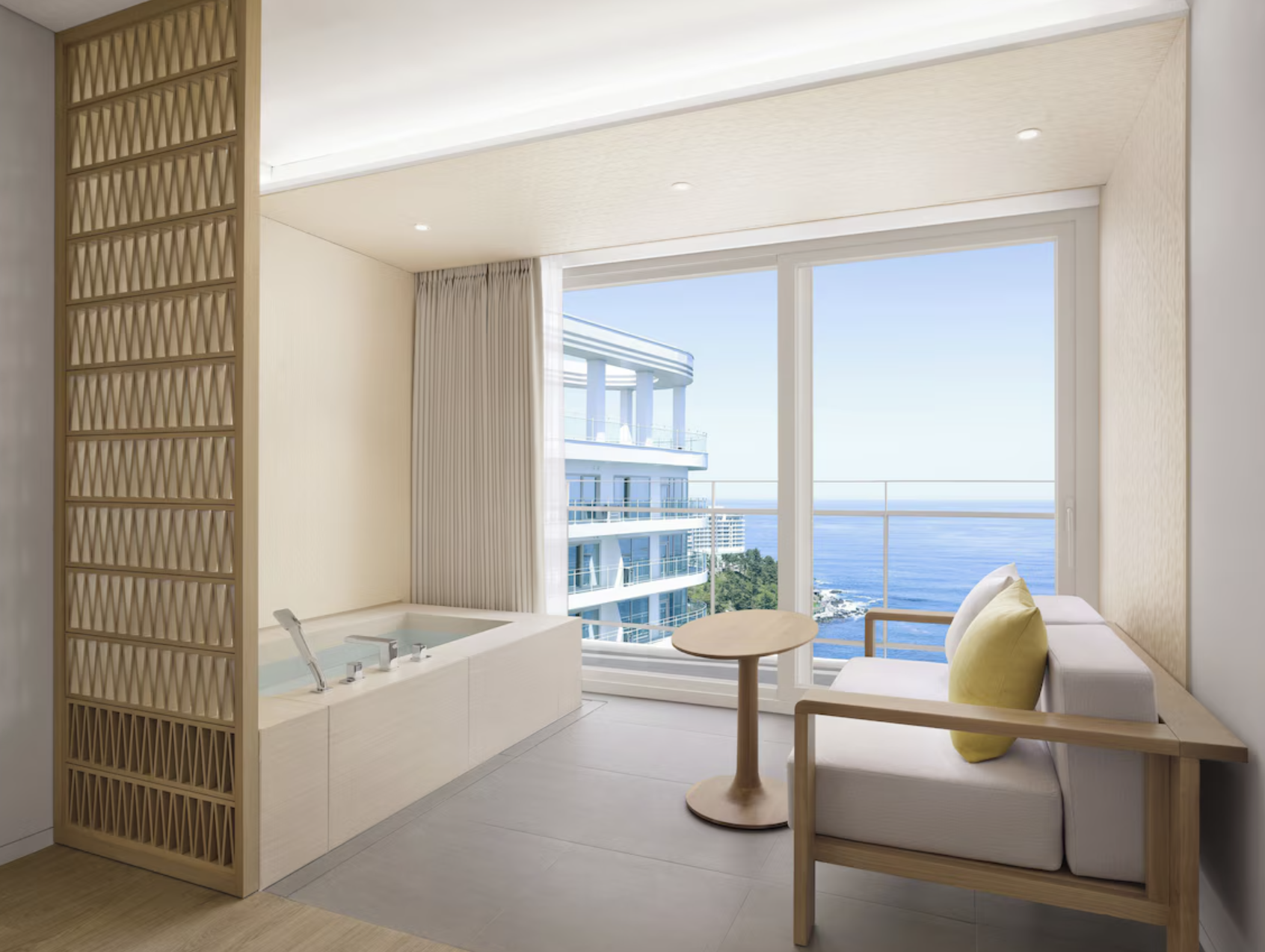 객실 자쿠지에서 반신욕하며 바다를 볼 수 있어 힐링하기 좋다.