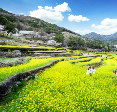 4월이면 계단식 논과 해안 절벽을 따라 노란 유채꽃이 만개해 멋진 풍경을 만든다.