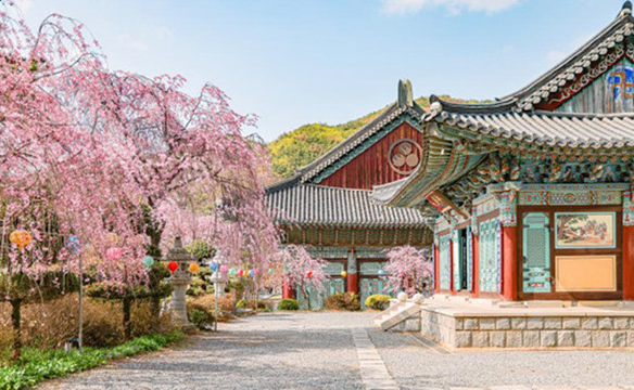 사찰 안은 고요한 분위기를 자아내며, 계단을 따라 흐드러진 겹벚꽃이 아름다워 사진 촬영지로 인기가 많다.