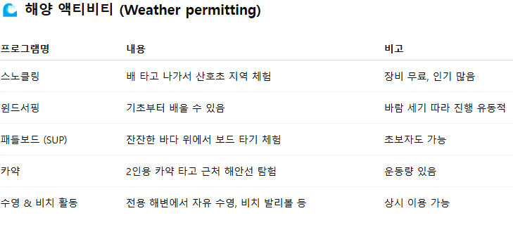 - 다양한 액티비티 (스노클링, 요가, 서핑 등)