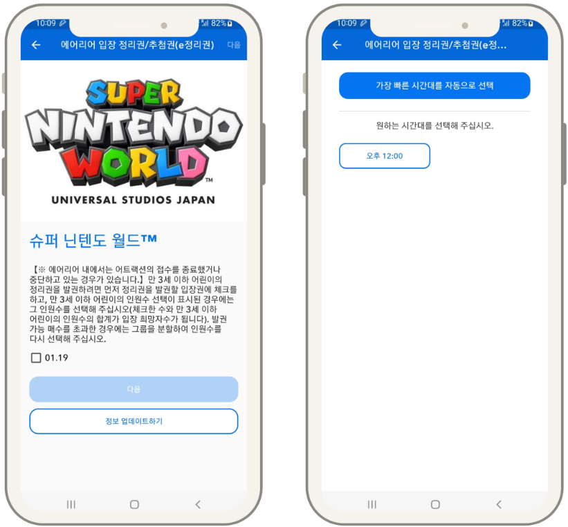 USJ 공식 앱 실행 → Area Timed Entry 선택 → 닌텐도월드 선택 → 원하는 시간 선택 → QR코드로 예약 확정 / 저장 → 입장 시 해당 QR코드 스캔