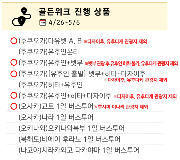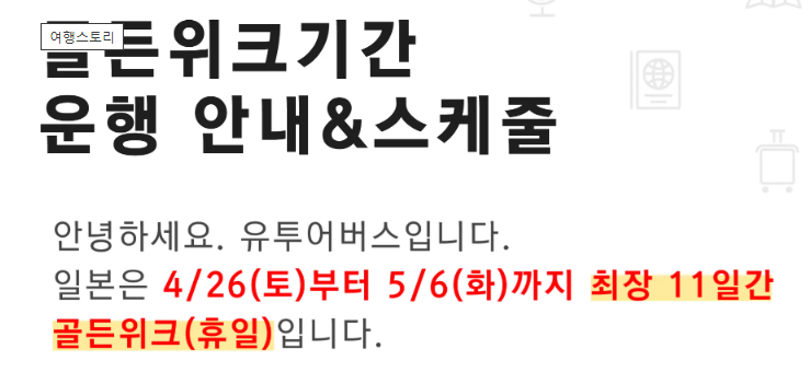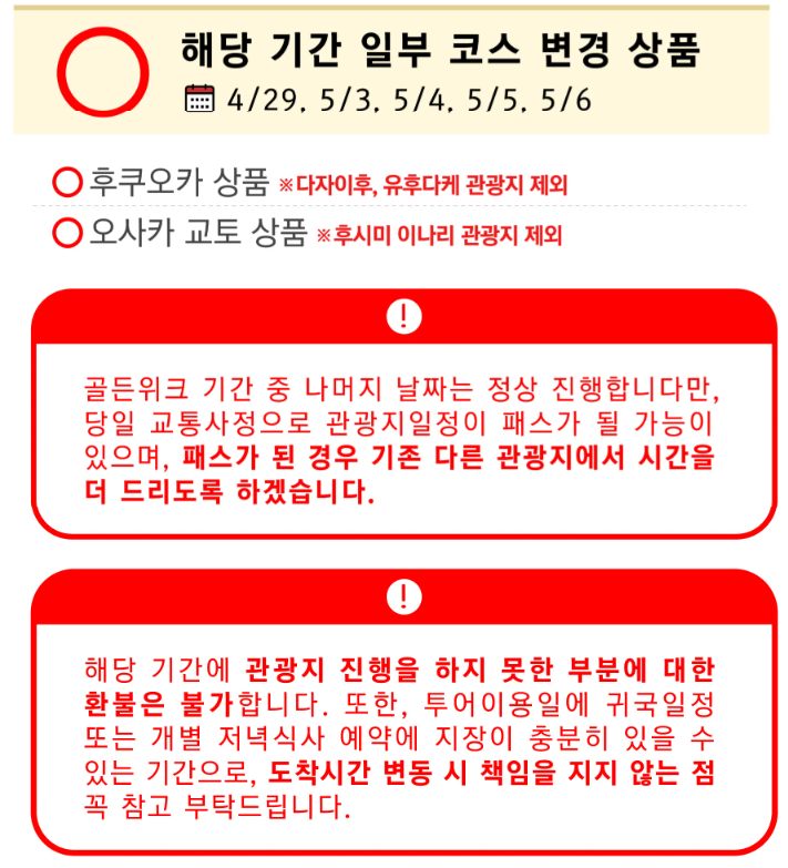 : 일본의 연휴 기간으로 매년 4월 말부터 5월 초까지 이어진다. (2025년 골든위크 : 4월26일~5월6일)이 기간에는 관광지와 교통이 혼잡할 수 있다. 골든 위크 기간에도 투어는 운영되지만 조기 예약이 필수적이다. 또한, 현지 상황에 맞춰 일정 변경, 시간 조정, 일부 관광지 패스, 가격 변동이 있을 수 있으니 사전에 확인하는것이 필요하다.