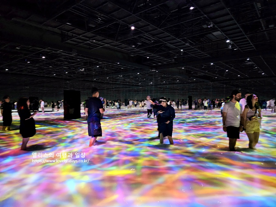 랩 작품 중에서 가장 인기 있는 몰입형 미술관 중 하나인 도쿄 팀랩 플래닛 (teamLab Planets TOKYO DMM). 맨발로 반짝이는 물 위를 걸으며, 움직임에 따라 변화하는 다채로운 빛과 소리에 흠뻑 빠지는 다양한 경험을 할 수 있다.
