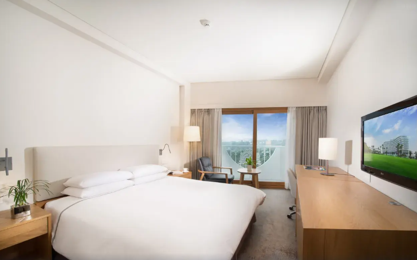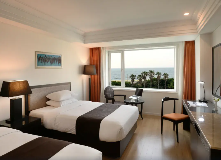 : 객실이 모던하고 깔끔하고 붙박이장 등 수납공간이 넉넉하다/ 객실에서 오션뷰를 감상할 수 있다