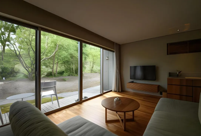 : 다다미방+침대 조합, 대형 창문으로 자연 전망 감상할 수 있다. 유명 공예가의 조명, 대나무 세공 등 세련된 인테리어가 인상적이다.