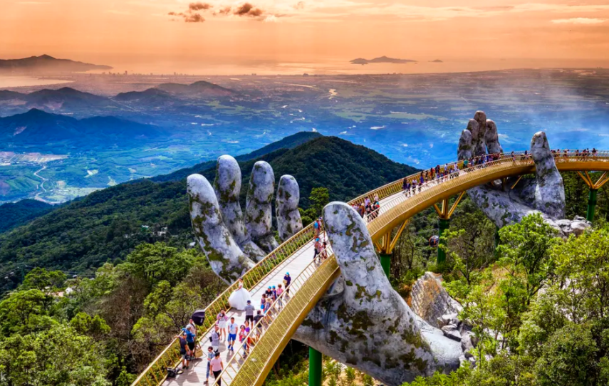 : 두 개의 거대한 손이 받치고 있는 황금색 다리로, 바나힐의 랜드마크이자 최고의 포토존이다,