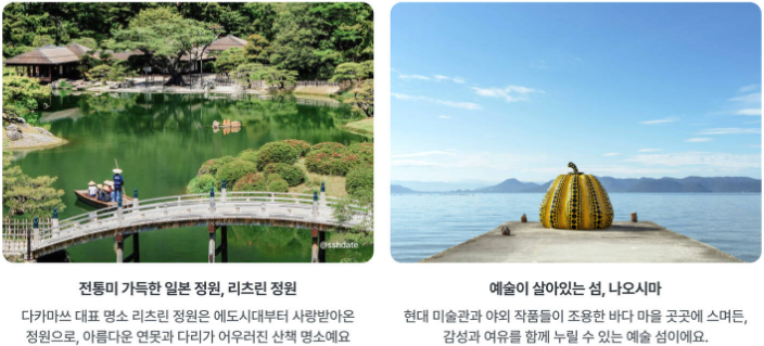 특히 나오시마·이나지마와 연계한 2박 3일 예술 여행 루트를 추천한다. 도시 중심에서 가까운 다카마쓰항은 예술의 섬 ‘나오시마’로 가는 배편이 있는 곳으로, 미술을 좋아하는 여행자라면 하루쯤 섬 여행도 계획해볼 만하다.