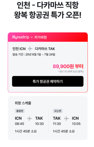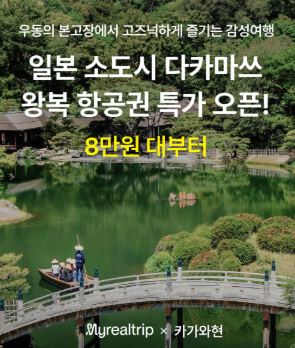 다카마쓰 항공권은 인천 출발 기준, 직항 LCC 노선이이 있으며 평소에 왕복 기준 10만 원대 초반~중반이면 좋은 가격으로 판단되었다. 하지만 이번에 마이리얼트립과 카가와현의 콜라보를 통해 이보다 더 저렴한 8만원대로 예약 가능한 프로모션을 시작했다.