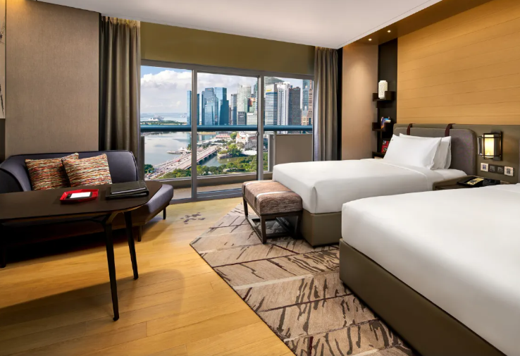 : 5성급 호텔답게 객실이 넓고 고급스럽다. 고층 객실에서는 싱가포르 시내 전경은 물론 마리나 베이 샌즈 야경도 감상 가능하다. 마리나베이 불꽃놀이, F1 레이싱 시즌에는 객실에서 뷰를 즐길 수 있어 인기 많다. 특히 고층 뷰 객실은 인기가 많아 조기 예약 필수라는 점! 단, 일부 객실은 리노베이션 전 스타일이므로 객실 상태 확인 필요하다.