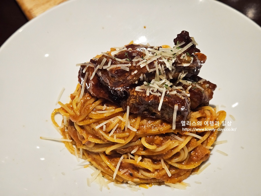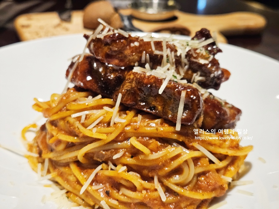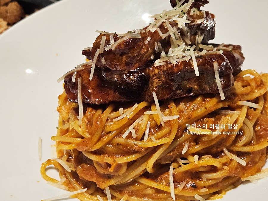 볼로네제 파스타에 폭립이 들어간 것이 특징