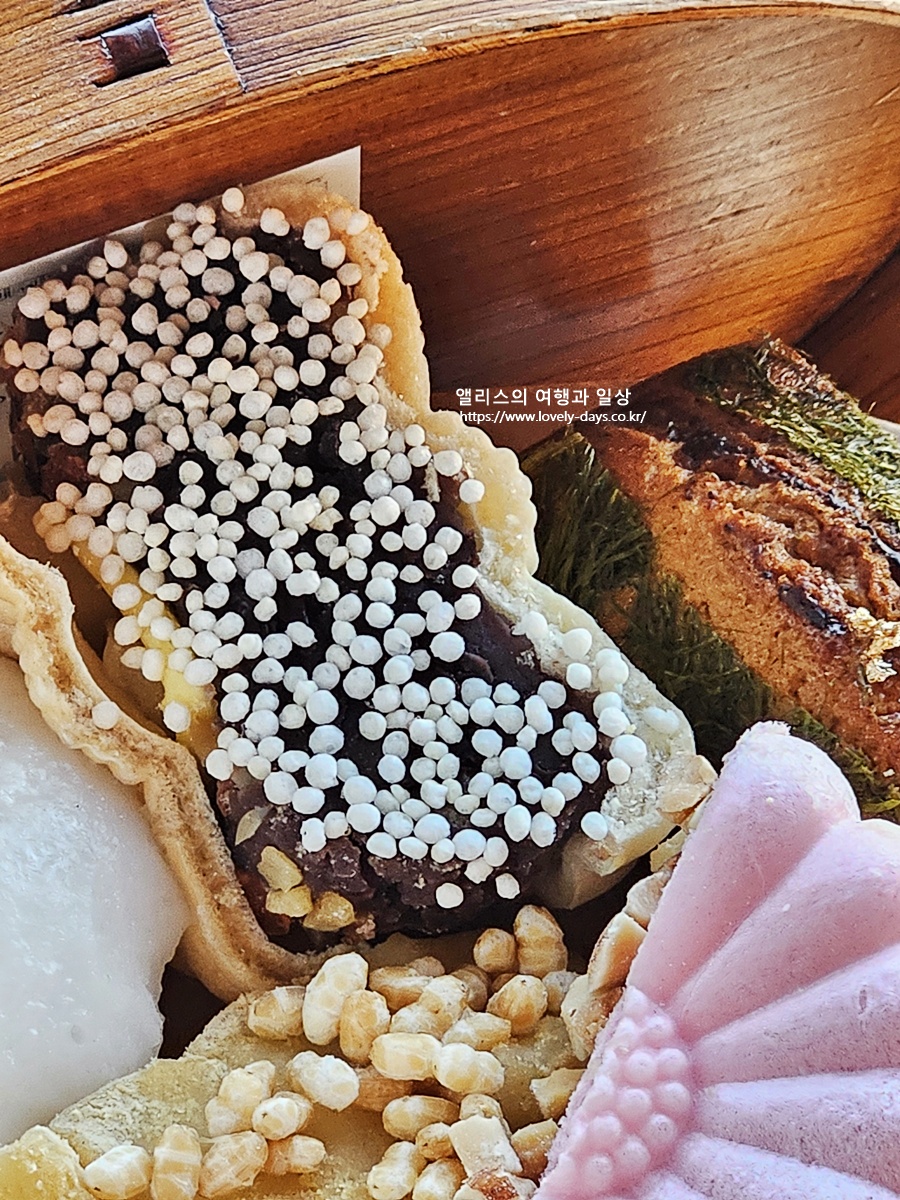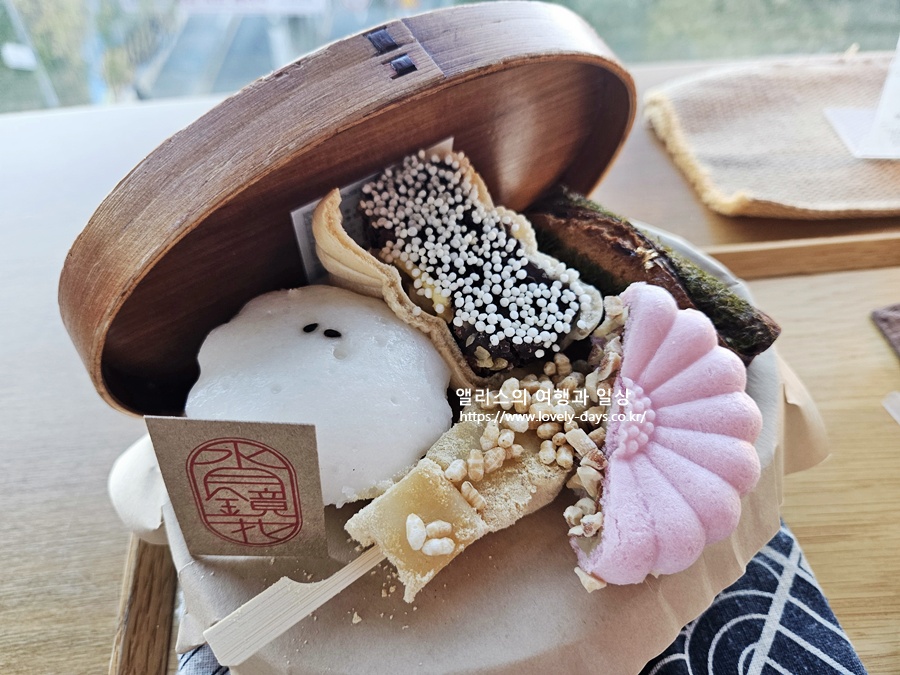 흑미 술빵, 인절미 꼬챙이, 이보아르 가나슈 모나카, 앙버터 모나카 등 한국적인 디저트가 예쁜 나무상자에 담겨 나온다.
