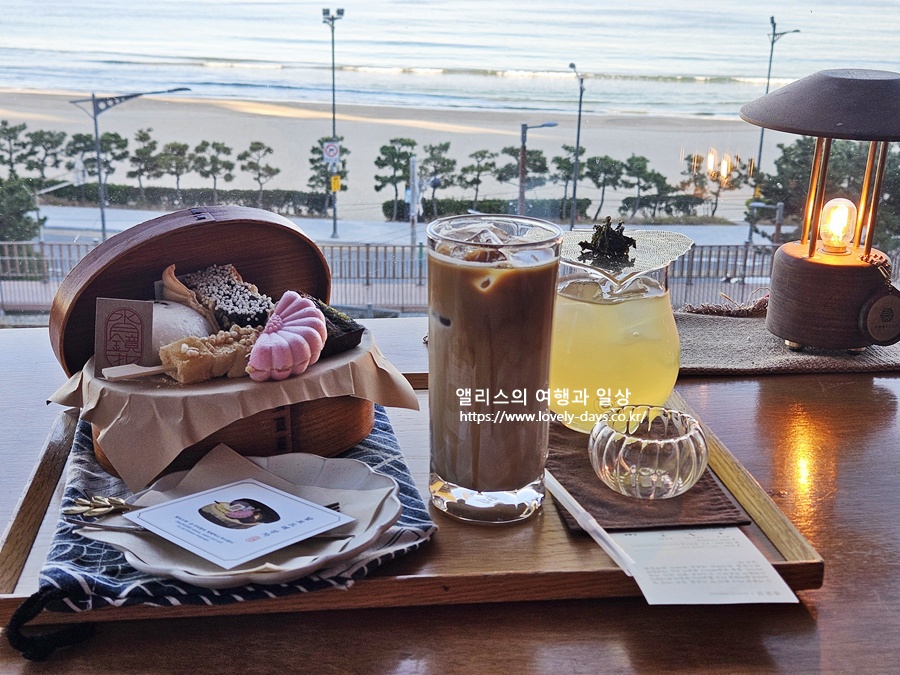 엄마가 주문한 카페라테인 가배오레까지 한 상에 담아 사진과 송정바다를 풍경으로 담아내면 꽤나 멋드러진 사진이 완성된다.