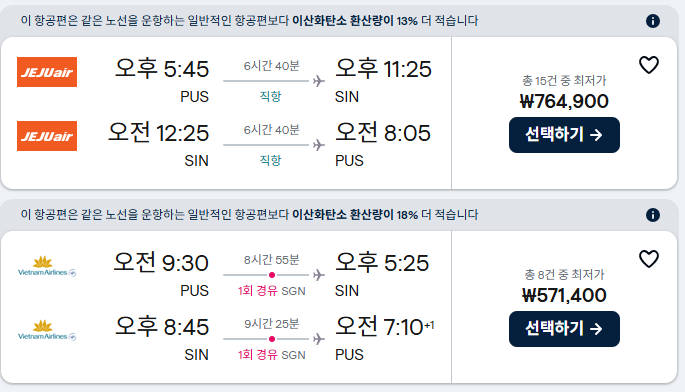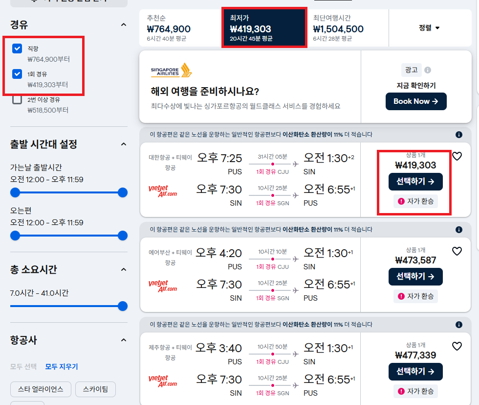 일단 부산은 싱가포르로 가는 직항이 거의 보이지 않는다. 유일한 직항 항공사는 제주 항공