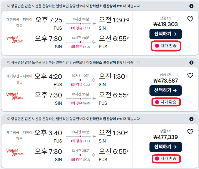 부산 김해공항 출발 싱가포르 항공권의 경유노선으로 눈을 돌리면 항공요금에 있어서 숨이 트이는 느낌이지만... 자세히 보면 "자가환승"이라는 압박글자가 있다.