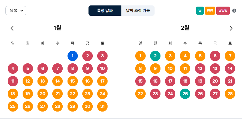 예를 들어 날짜를 보았을 때 초록색이 보이면 가장 저렴한 출/도착 시기이다.